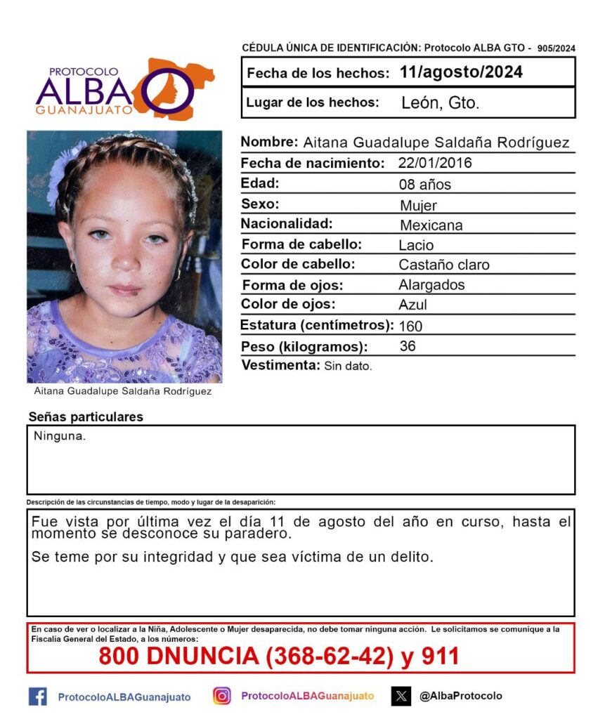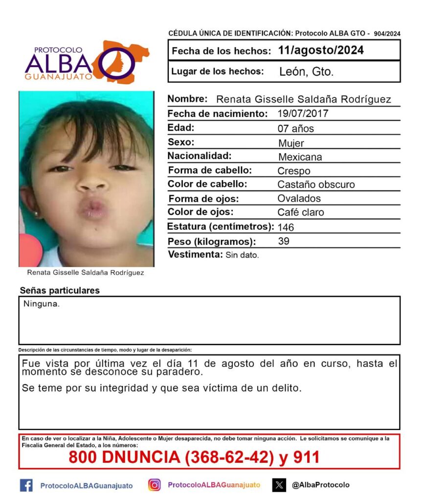 Gunajuato.- El PROTOCOLO ALBA tiene por objeto establecer estrategias y acciones de coordinación entre autoridades, para la búsqueda inmediata y localización de Niñas, Adolescentes y Mujeres desaparecidas en el Estado de Guanajuato, como es el caso de lo que pueder ser una familia, la mamá y tres menores niñas.