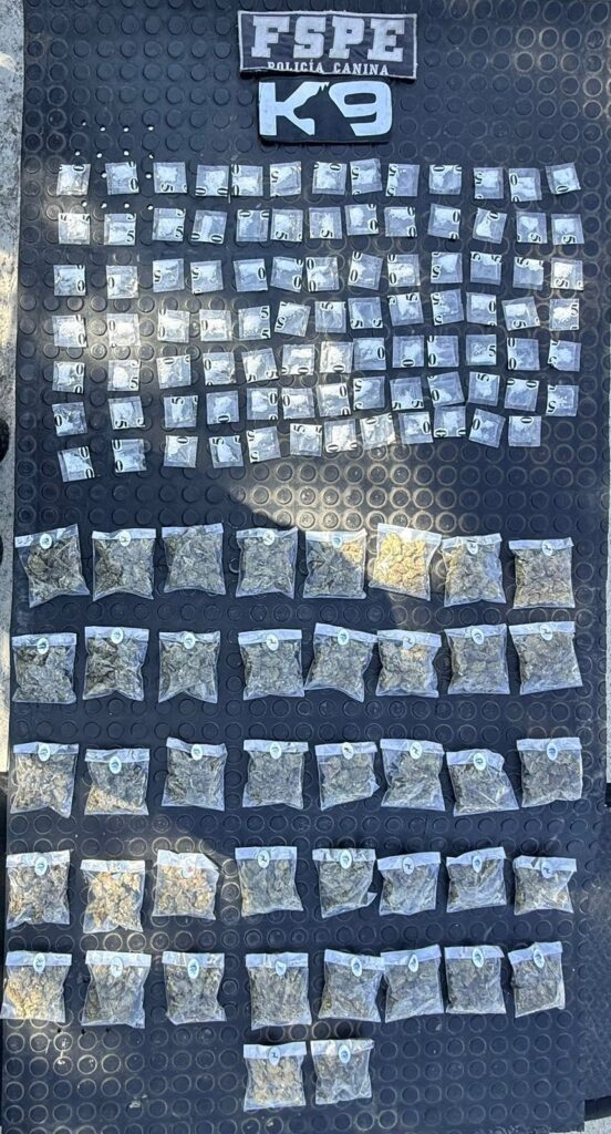 El oficial canino Orkan, marcó de manera positiva una bolsa negra que la persona sostenía. En su interior fueron localizadas 42 bolsitas con hierba seca con características de marihuana, 90 bolsitas con sustancia granulada tipo cristal, equivalentes a 332 dosis de marihuana y 108 dosis de cristal.