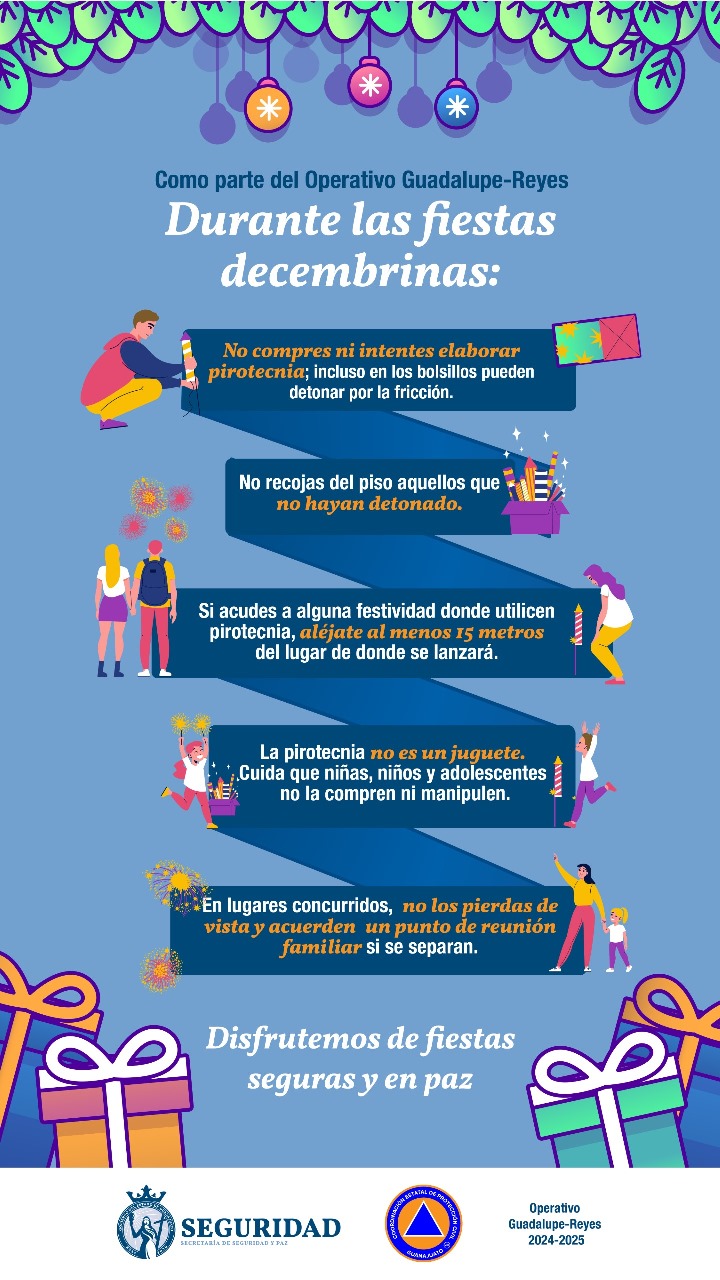 Para aquellos que decidan adquirirlos, el funcionario destacó la importancia de hacerlo únicamente en establecimientos que cuenten con los permisos otorgados por la Secretaría de la Defensa Nacional (SEDENA), la entidad responsable de normar y supervisar su venta. “Si ellos entregaron estos permisos es porque en estos lugares cumplen con todos los requisitos y también han sido supervisados por Protección Civil. Así que lo que quedaría para su utilización de manera segura es que estos sean hechos por solamente la gente adulta y en espacios abiertos”, explicó.